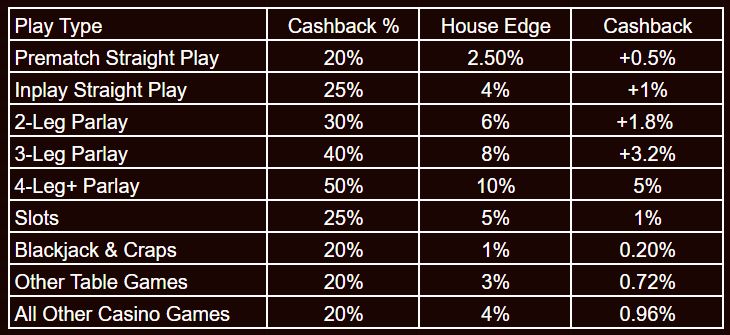 A: All sports plays and casino games contribute to your cashback. However, voided plays, plays made with other bonus funds, and hedged/arbitrage plays do not qualify.